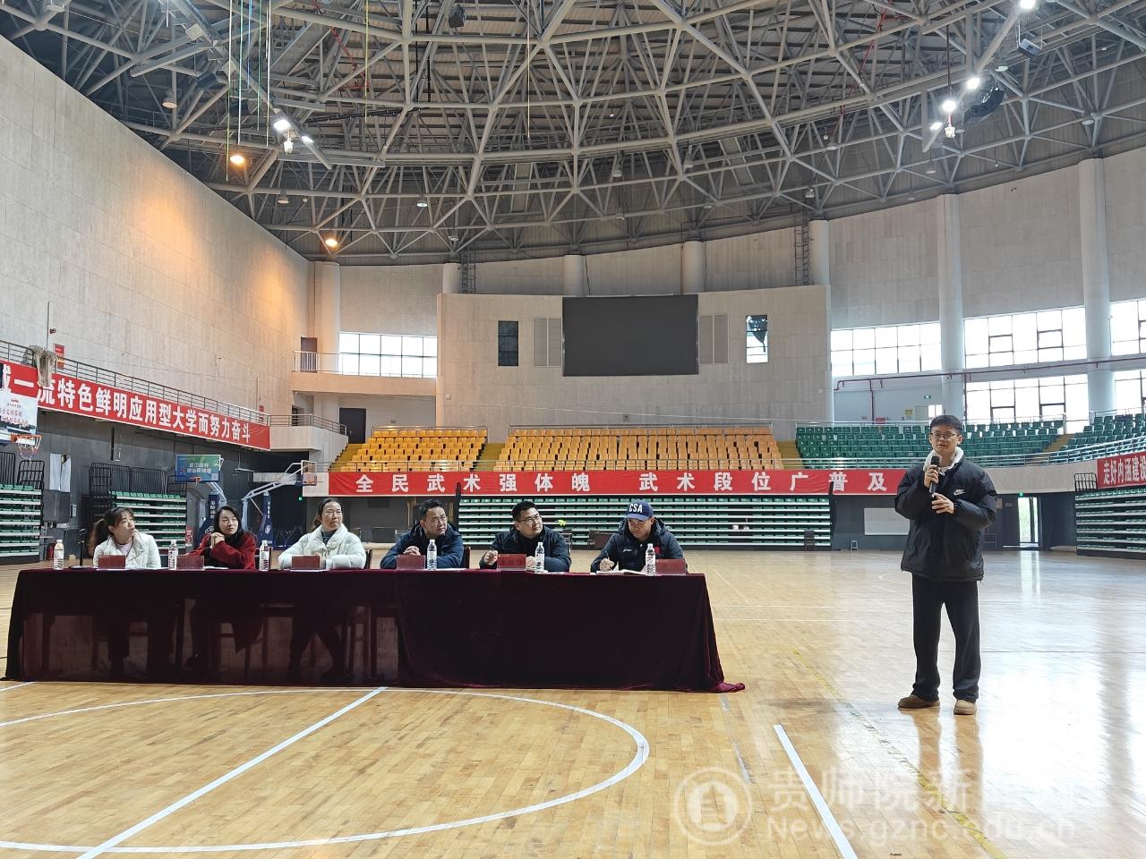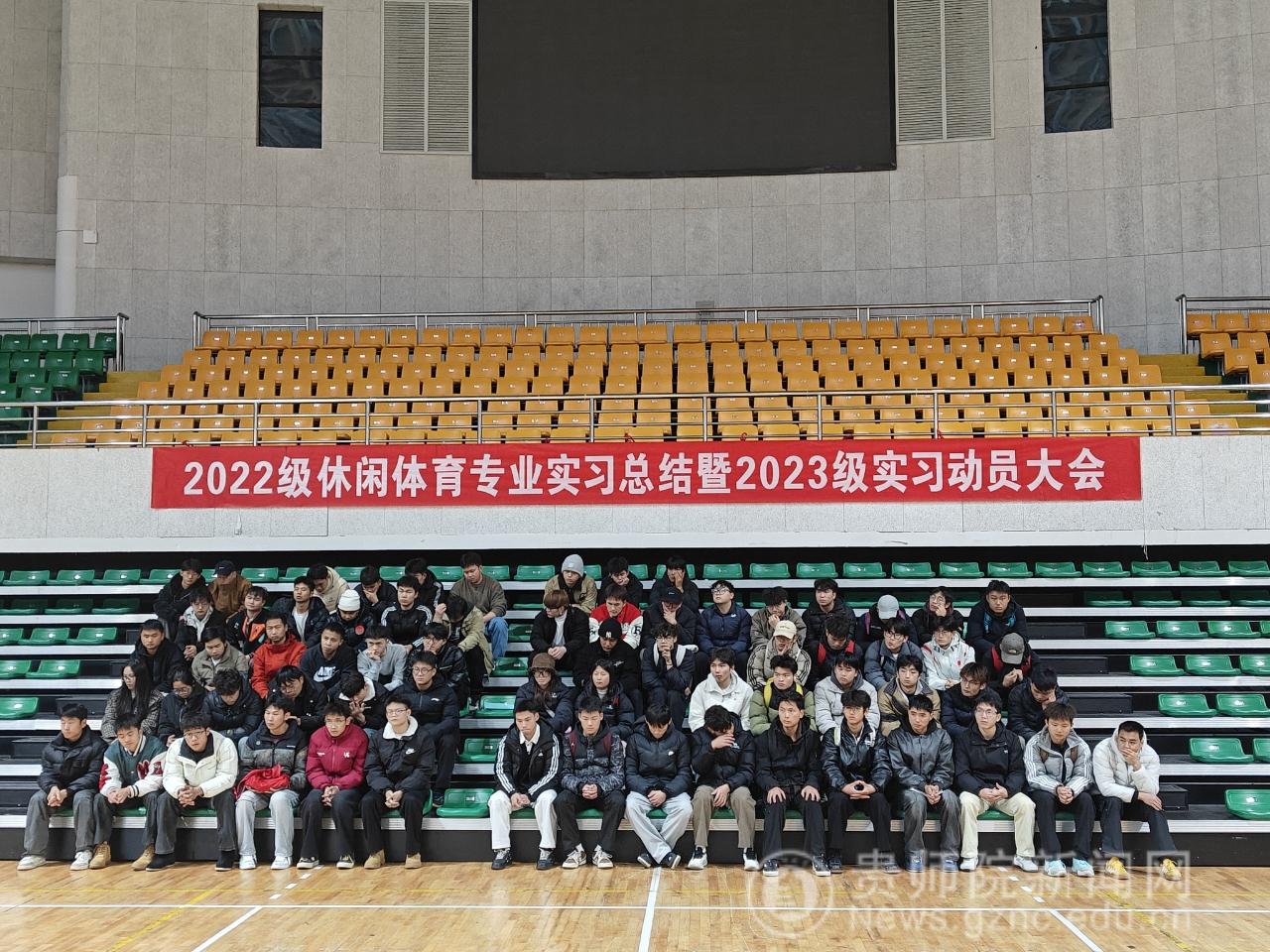2025年12月11日中午在体育馆召开2022级休闲体育专业实习总结暨2023级实习动员大会。体育学院党委书记汤士波、院长邬孟君、副院长朱继伟、休闲体育系主任刘晓燕、学院实习负责人何海艳、校外实习负责人严江参加大会。大会由何海艳主持。