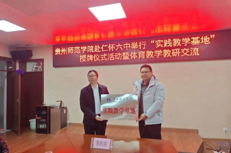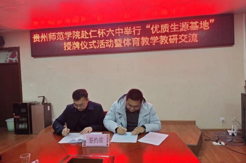 2024年12月18日,贵州师范学院“优质生源基地”、“实践教学基地”签约授牌仪式在仁怀六中举行,贵州师范学院体育学院副院长朱继伟、实习负责人李军卫、杨昌美名师工作室成员,仁怀六中党委书记王利、校长陈现虎、副校长冯沛亮、蔡浪、工会主席王德强、教务处主任黄静等参加本次仪式。