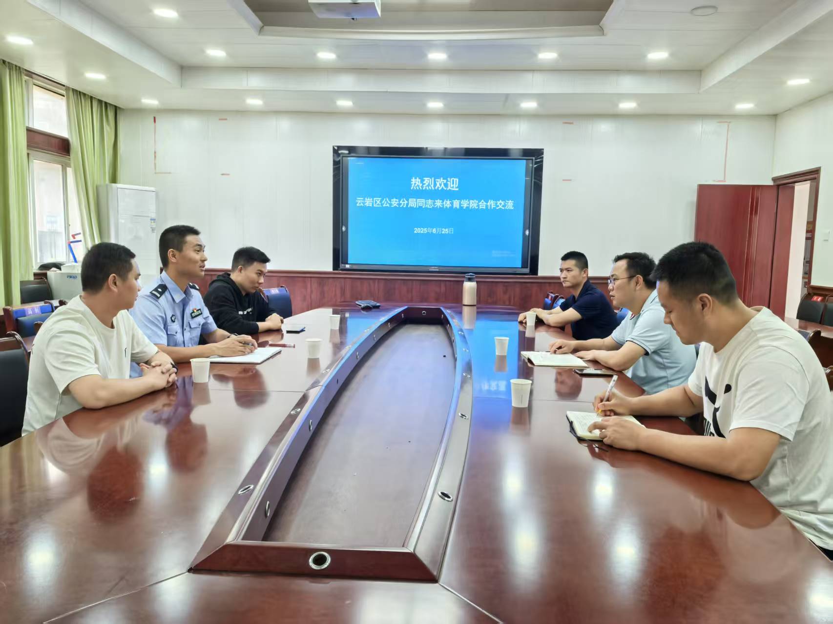 为拓宽体育专业学子就业渠道,充实公安队伍力量,近日,贵阳市公安局云岩分局辅警招考座谈交流会在体育学院会议室举行。分局政工室相关负责人、体育学院党委书记汤士波、副书记刘华伟、唐孟老师参加了座谈交流会。